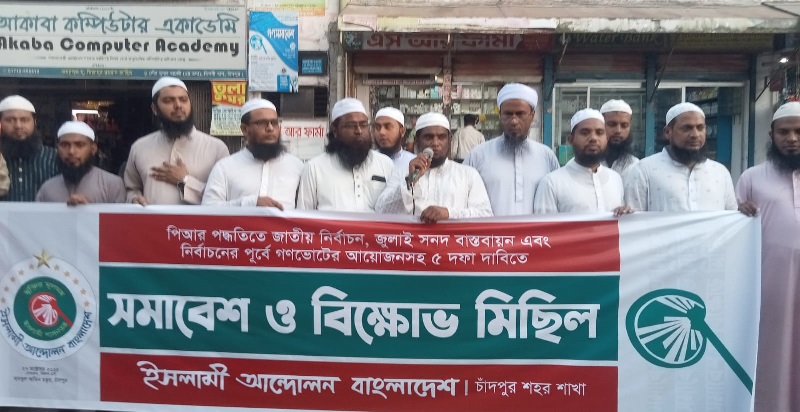 আগামী জাতীয় নির্বাচনের আগে জুলাই সনদ বাস্তবায়ন, তার ওপর গণভোট আয়োজন, নির্বাচনে উভয় কক্ষে পিআর পদ্ধতি চালু, সকলের জন্য লেভেল প্লেয়িং ফিল্ড নিশ্চিত, ফ্যাসিস্ট সরকারের জুলুম-নির্যাতন ও দুর্নীতির বিচার এবং জাতীয় পার্টি ও ১৪ দলের কার্যক্রম নিষিদ্ধের দাবিতে ইসলামী আন্দোলন বাংলাদেশ চাঁদপুর শহর শাখার উদ্যোগে সোমবার বিকেল ৪টায় শহরের বিপণীবাগ জেলা কার্যালয়ের সামনে বিক্ষোভ মিছিলপূর্ব সমাবেশ অনুষ্ঠিত হয়।