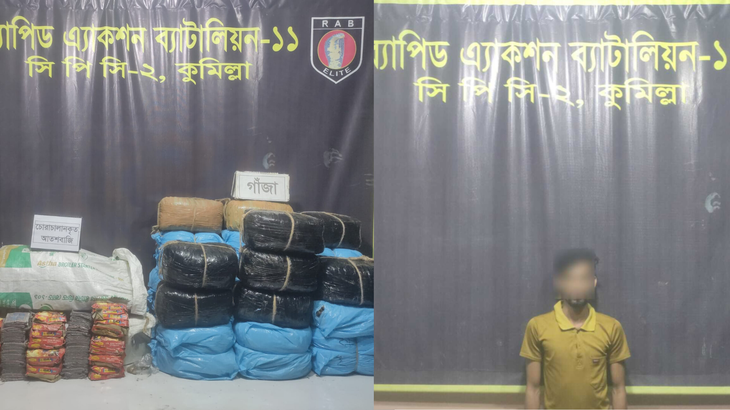 রোববার (২০ জুলাই ২০২৫)  বিকেলে র‌্যাব-১১, সিপিসি-২-এর একটি বিশেষ আভিযানিক দল গোপন সংবাদের ভিত্তিতে কুমিল্লা জেলার ব্রাহ্মণপাড়া উপজেলাধীন শশীদল এলাকায় মাদকবিরোধী অভিযান পরিচালনা করে। অভিযানে মো. হৃদয় হাসান (২৪) নামক ১ জন মাদক ব্যবসায়ীকে গ্রেফতার করতে সক্ষম হয়। এ সময় আসামীর হেফাজত হতে ৮৪ কেজি গাঁজা ও ২১ হাজার পিস আতশবাজি উদ্ধার করা হয়।