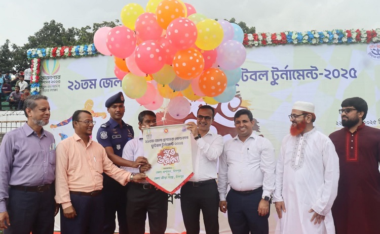 চাঁদপুর জেলা স্টেডিয়ামে বর্ণিল আয়োজনের মাধ্যমে মাঠে গড়ালো ২১তম জেলা প্রশাসক গোল্ডকাপ ফুটবল টুর্নামেন্ট। সোমবার (২২ সেপ্টেম্বর ২০২৫) বেলুন উড়িয়ে টুর্নামেন্টের উদ্বোধন ঘোষণা করেন চাঁদপুর জেলা প্রশাসক মোহাম্মদ মোহসীন উদ্দিন। জাতীয় সঙ্গীত, জাতীয় পতাকা, ক্রীড়া পতাকা এবং চাঁদপুর জেলার ৮টি উপজেলার ক্রীড়া সংস্থার পতাকা উত্তোলনের মাধ্যমে শুরু হয় এই টুর্নামেন্ট। উদ্বোধনী অনুষ্ঠানে আরো উপস্থিত ছিলেন, চাঁদপুর পৌর প্রশাসক ও স্থানীয় সরকার বিভাগের উপপরিচালক উপসচিব গোলাম জাকারিয়া, অতিরিক্ত জেলা প্রশাসক (সার্বিক) মো: এরশাদ উদ্দিন, ফরিদগঞ্জ উপজেলা নির্বাহী অফিসার সুলতানা রাজিয়া, মতলব দক্ষিণ উপজেলা নির্বাহী অফিসার আমজাদ হোসেন, জেলা জামায়াতের সেক্রেটারি অ্যাডভোকেট. শাহজাহান মিয়া, শিক্ষা অফিসার মোহাম্মদ রুহুল্লাহসহ বিভিন্ন সরকারি কর্মকর্তা, রাজনৈতিক দলের নেতৃবৃন্দ এবং ক্রীড়া সংগঠকরা।