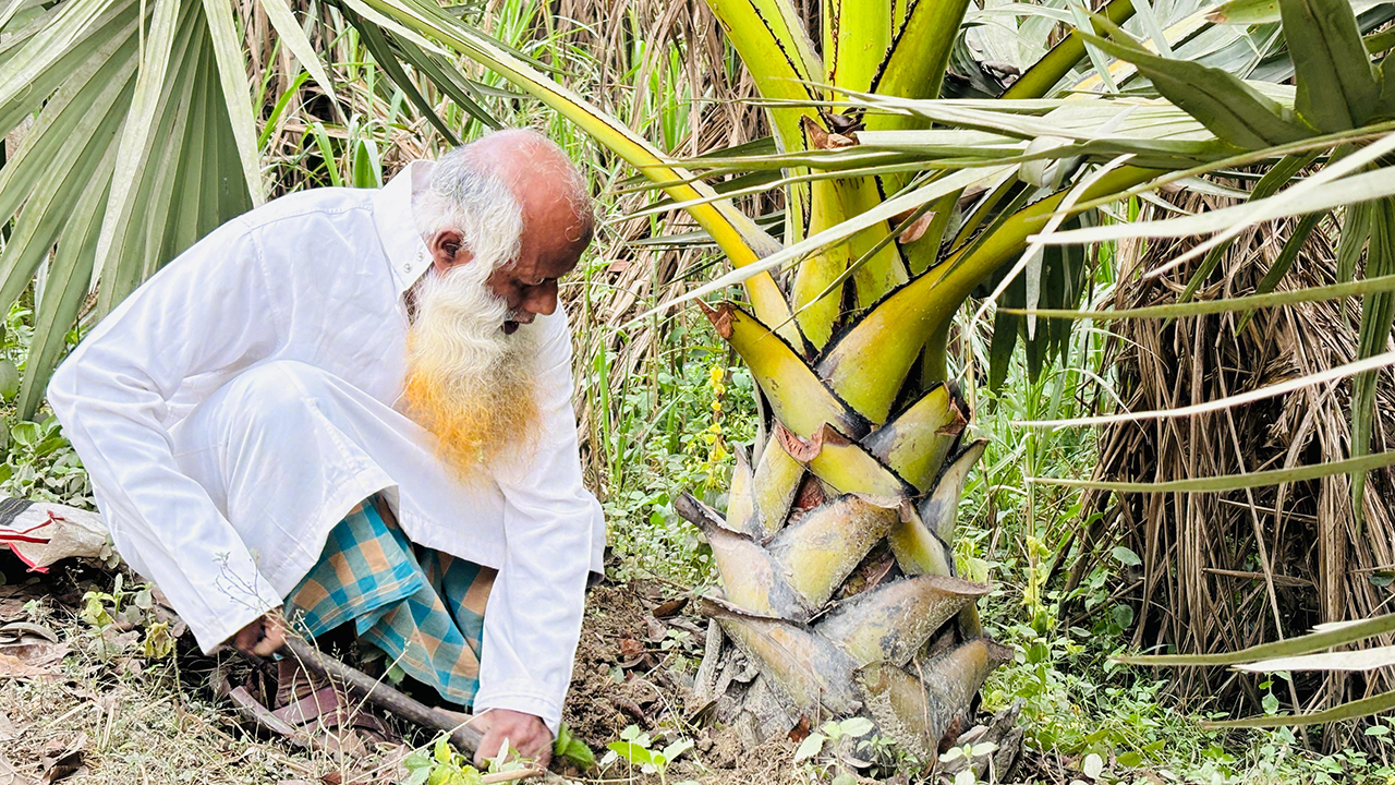 শীতের তীব্রতায় যখন অনেকে ঘরে বসে উষ্ণ আবহে থাকেন, তখনো হিমেল হাওয়ার মধ্যে রাস্তার পাশে তালগাছের পরিচর্যা করতে দেখা যায় ৭১ বছর বয়সী খোরশেদ আলীকে। শুধু শীত নয়, গ্রীষ্মের অসহনীয় গরম কিংবা বর্ষাকালের প্রবল বৃষ্টিতেও একই কাজ করেন তিনি। দীর্ঘ ১০ বছর ধরে এভাবেই প্রতিদিন ভোরে প্রয়োজনীয় সরঞ্জামসহ একটি মোটরসাইকেল নিয়ে বেরিয়ে পড়েন। তারপর গাছের পরিচর্যায় ব্যস্ত সময় পার করেন বৃক্ষপ্রেমী খোরশেদ আলী।